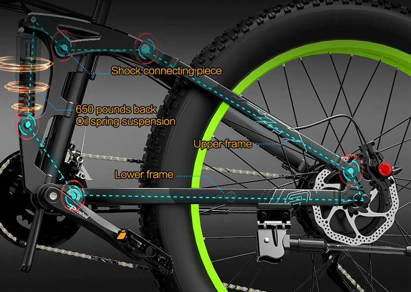 Αυτό το ποδήλατο διαθέτει διπλό αμορτισέρ ελατηρίου λαδιού μπροστά και πίσω για ομαλή οδήγηση και ένα πίσω αμορτισέρ ελατηρίου λαδιού με χωρητικότητα 650 λίβρες για πρόσθετη σταθερότητα.